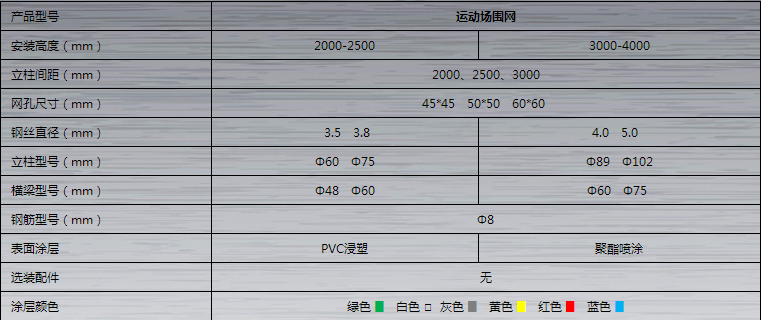 體育場圍網具有防腐、防老化、抗曬、耐候、色彩鮮亮、網面平整,強力張緊,不易受外力撞擊變形、現場施工安裝、靈活性強(可根據現場要求隨時調整造型和尺寸)的有點??蛇x顏色:藍色、綠色、黃色、白色等。