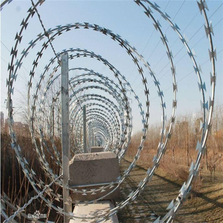 近年發展起來的防護、隔離能力較強的新型防護網產品。它采用鋼板沖壓成型包附于鋼絲之上,由銳利尖角鍍鋅鋼板或不銹鋼薄板做刀片,高張力鋼絲做芯線組合而成的。根據形狀可分為:螺旋式-刀片刺網、交叉式-刀刺網、平板式-刀片刺網、直線式-刀片刺網。被廣泛應用在監獄,機場,軍事基地等高安全場所。