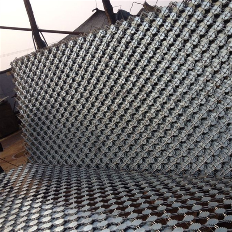 5、刀片滾網、拉絲、卡扣,均采用不銹鋼材質。刀刺網安裝固定卡扣整體調正,使刀刺網不出現擰轉情況,刀刺刺圈分布均勻,每隔30-40cm與拉絲固定;分段連接處需將兩端刀刺網做連接固定,刀刺網固定點需緊鎖不得出現松動、脫落現象;刀刺網安裝與隔離網平行,上下左右均成直線延伸,轉角處需做加密加固處理。