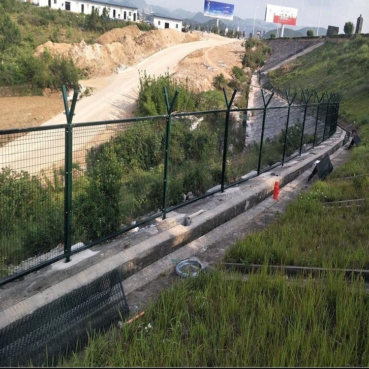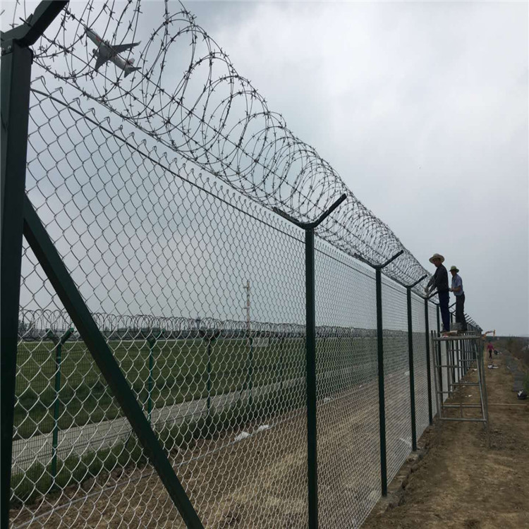 機場護攔網又稱作“Y型安全防御護網”,由Y型支架立柱,加強型焊接網,安全防盜連接件和熱鍍鋅刀片刺網組成,是強度和安全防御性